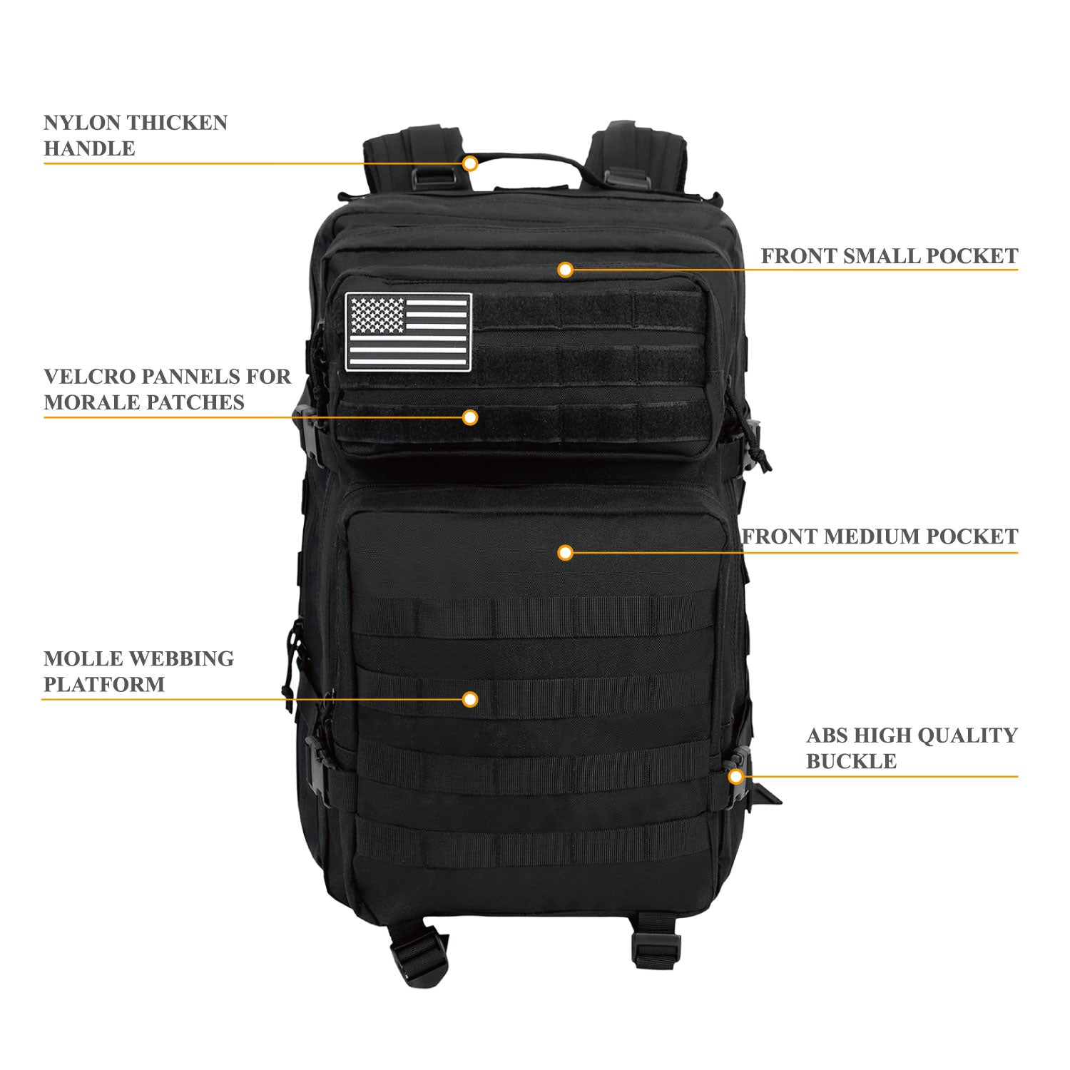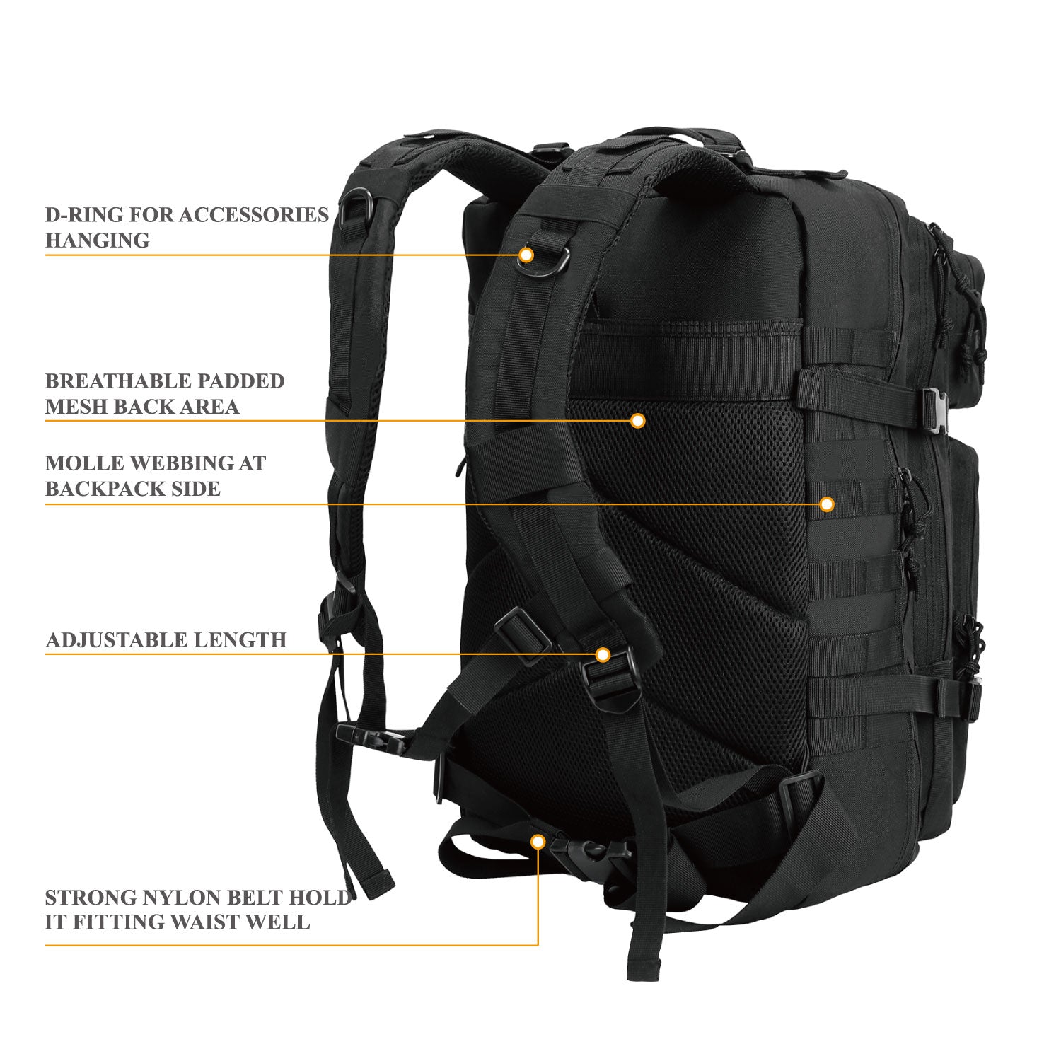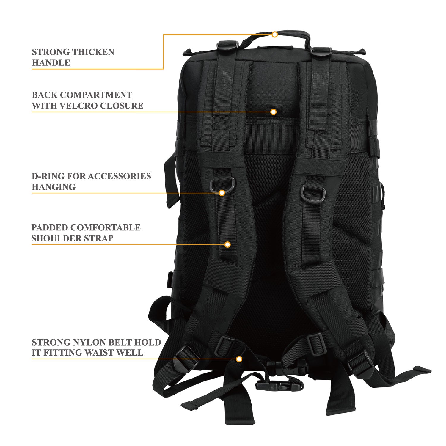 - DURABLE BACKPACK WITH EXCELLENT CONSTRUCTION: (1) Main Compartment can Load Clothes, Shoes, Laptops or whatever you need to take (2) Two Front Smaller Pockets and Molle Supply Systems (3)Velcro for your Favorite Patches (4) All Pockets with High Quality and Smooth Zippers (5) ABS High Quality Buckles with Adjustable Belt (6) Side Straps Hold it Fitting Waist Well (7) Thicken Padding Back with Breathable Mesh Material.