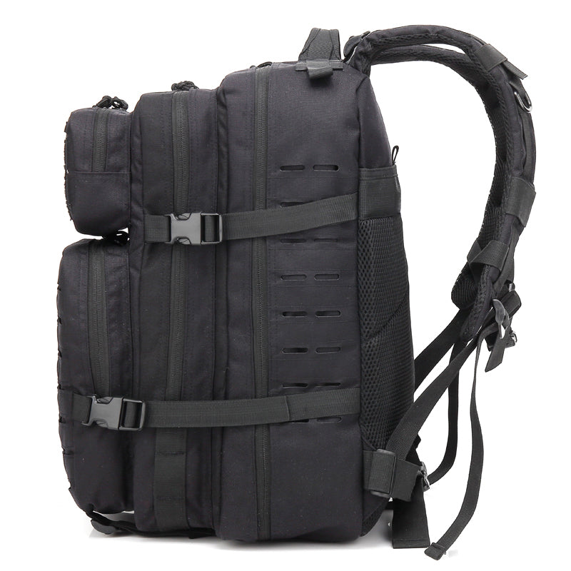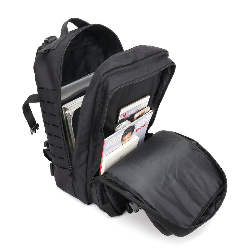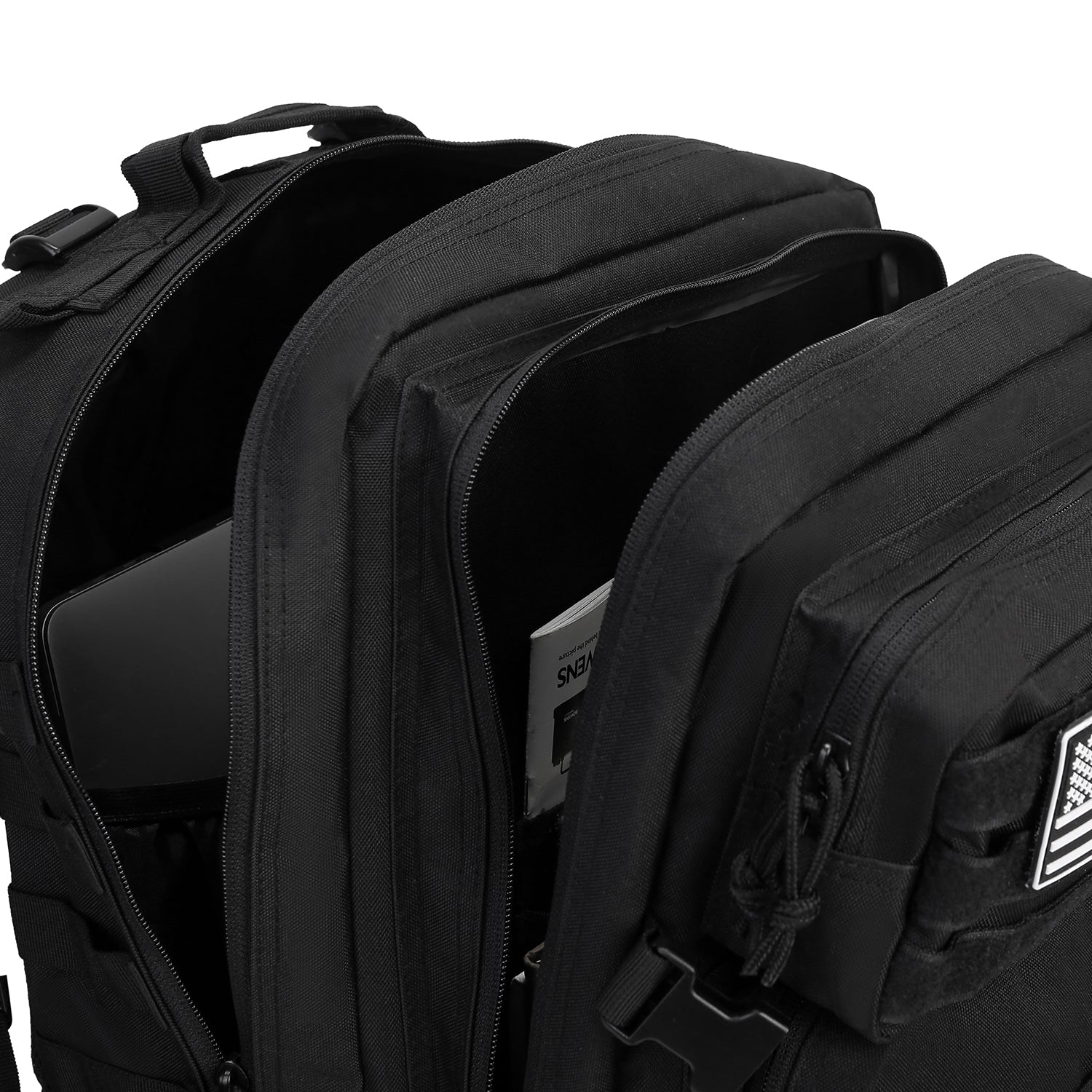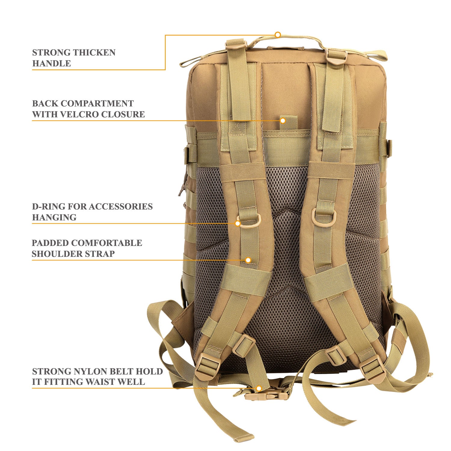 - DURABLE BACKPACK WITH EXCELLENT CONSTRUCTION: (1) Main Compartment can Load Clothes, Shoes, Laptops or whatever you need to take (2) Two Front Smaller Pockets and Molle Supply Systems (3)Velcro for your Favorite Patches (4) All Pockets with High Quality and Smooth Zippers (5) ABS High Quality Buckles with Adjustable Belt (6) Side Straps Hold it Fitting Waist Well (7) Thicken Padding Back with Breathable Mesh Material.