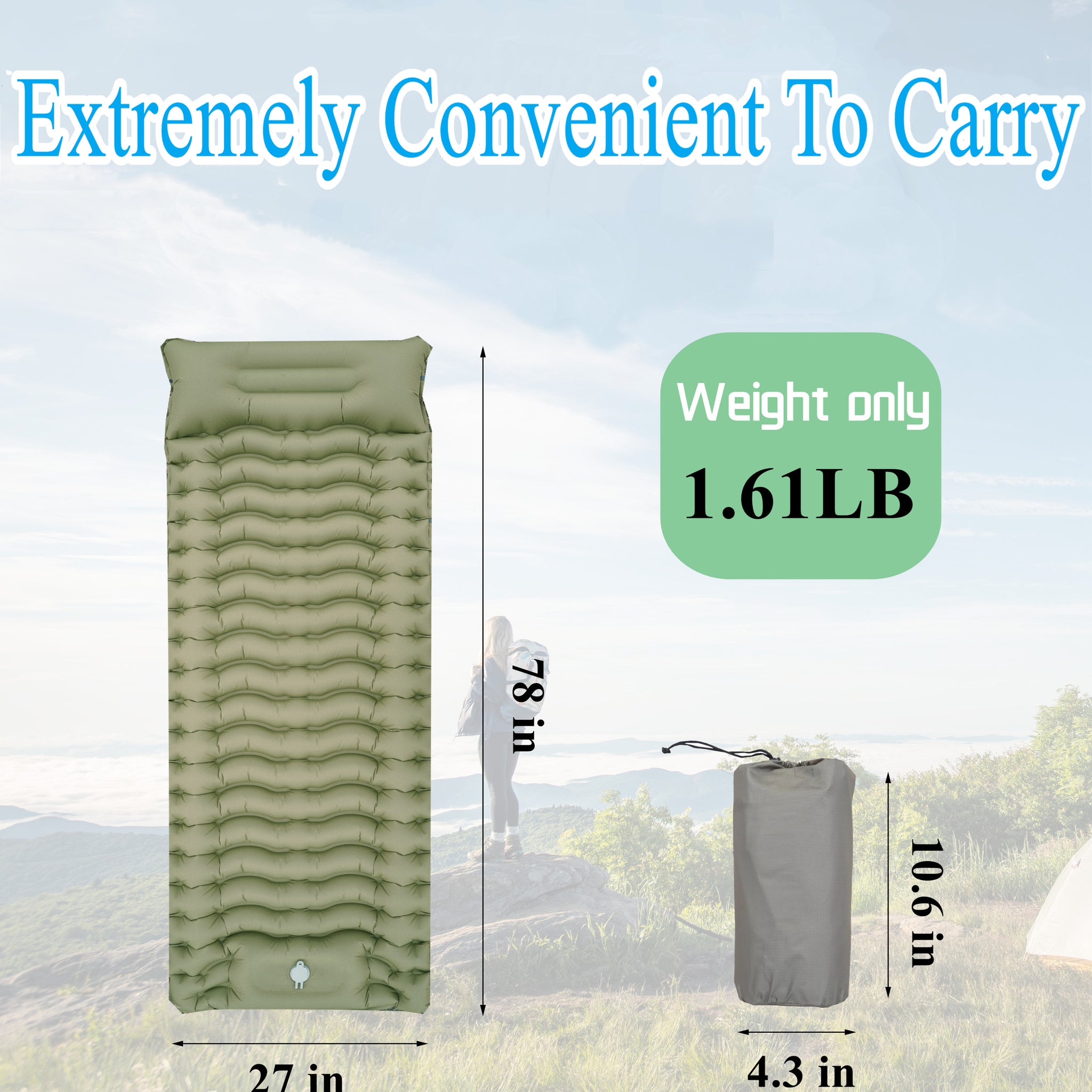 【Lightweight Strong Weight Bearing】This camping pad is made of thick 40D nylon and TPU, Weight Bearing 660Lbs, Water and Tear resistant, 78"L x 27"W large size Sleeping Pad, which provides more room to stretch out.Ultralight sleeping pad folds up to 10.6"L x 3"W and weighs only 1.54lb, Nylon Drawstring Pouch Packing fits into a backpack or suitcase. The sleeping mat is portable for travel, camping, tent, fishing, backpacking, beach,survival, etc