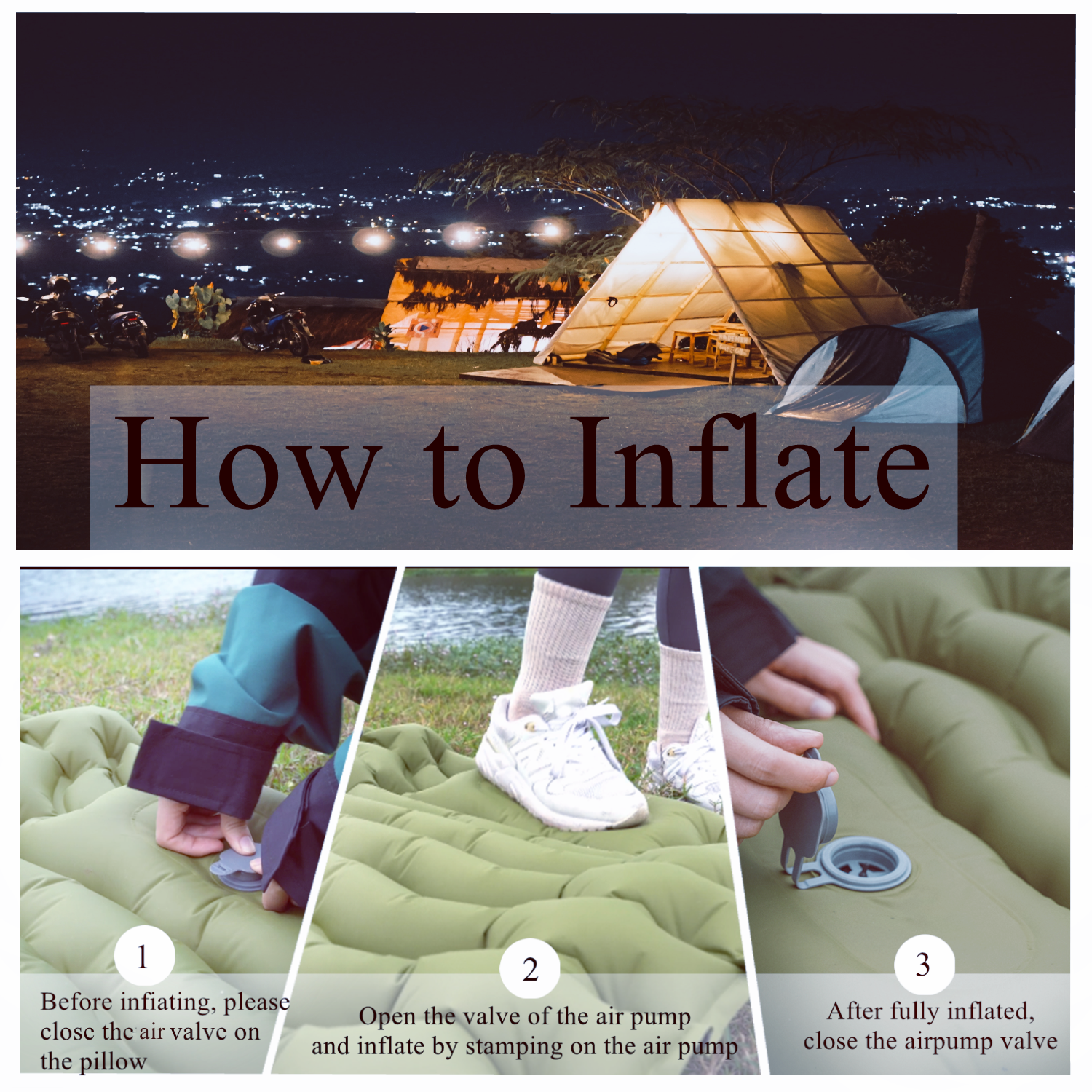 【Quickly Inflate and Deflate】Simply Press the built-in air pump at the bottom of the camp pad for only a moment,NO NEED to inflate it by your mouth, hands or a pump. Just take 1 sec achieve super quick to deflate. It WON’T LEAK until you pack it away